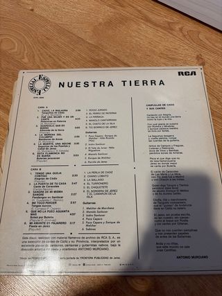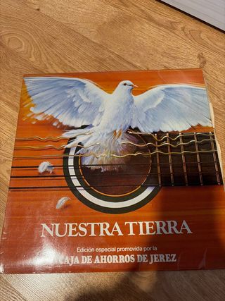 Disco de vinilo del álbum Nuestra Tierra. - Edición especial promovida por la Caja de Ahorros de Jerez. - Portada con diseño de una paloma blanca y una guitarra.