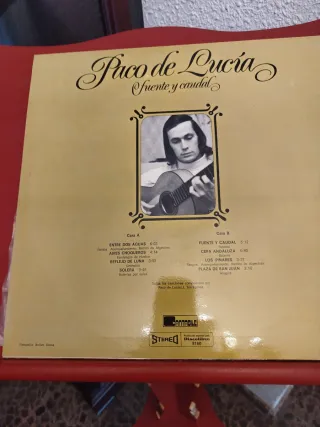 Disco de vinilo del aclamado artista Paco de Lucía. - Género: Flamenco y Sevillanas. - Portada con guitarra y silla.