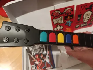 HAZME TU OFERTA!Vendo pack de Guitar Hero II para PS2.La guitarra está impoluta,solo se ha usado una vez para probarla,los botones y el rasgueo están rígidos como el primer día. Guitarra Gibson SG (Cable):Estado 10/10. Sin marcas de uso. Videojuego Original:Disco en muy buen estado,con su caja y manual originales. Caja de cartón interior:Conservo el embalaje interno original que mantiene la guitarra protegida y encajada. Nota sobre el estado:La caja exterior(la decorada)está dañada, por lo que no la incluyo o la envío solo si el comprador la quiere,pero el interior y el equipo están impecables. Envío rápido y protegido o en mano.