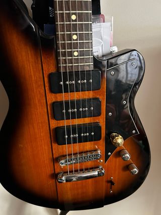 SOLO VENTA, NO CAMBIOS. Rareza, ya no se fabrican. Hechas en Corea. Cuerpo de Agathis madera tonal, abeto superior. Mástil Arce Hardrock, diapasón de Palisandro. Pastillas 2 single coil y una tipo P90 en el puente. Wilkinson W90 WVS. Escala: 25’5’’. Selector 5 posiciones para las 3 pastillas. INCLUYE TRÉMOLO Mástil en muy buen estado Correa roja incluida. Pequeño desperfecto en clavijero (ver última foto) Venta en mano en Madrid centro (Lavapiés) tags: stratocaster, telecaster, sg, les paul, crestwood, firebird, flying v, gibson, fender, epiphone, squier, gretsch, ibanez, esp, jackson, duesenberg, danelectro, eastwood