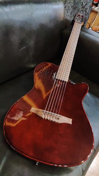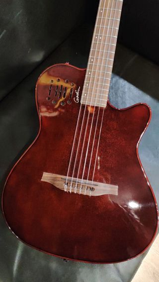 Guitarra Godin Multiac Mundial con un acabado en color rojizo y detalles en madera. - Cuerpo con acabado brillante. - Mástil de madera. - Diseño de cuerdas de nylon.