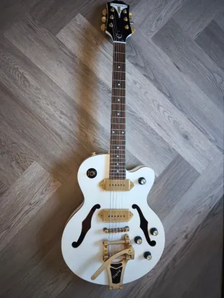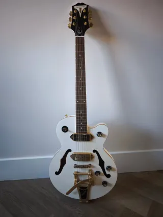 Guitarra eléctrica Epiphone Wildkat en edición limitada con Bigsby. En perfecto estado. Apenas se ha utilizado. - Color blanco. - Acabados dorados en herrajes y pastillas. - Diseño semi-hollow body.