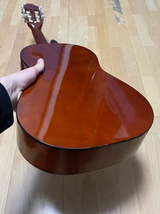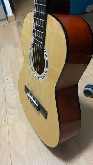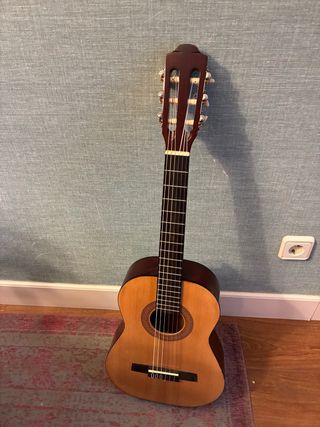 Guitarra española de tamaño reducido, ideal para niños que se inician en la música. Comprada por 65€. Nunca utilizada. - Cuerpo de madera clara. - Mástil de madera oscura. - Clavijero plateado.
