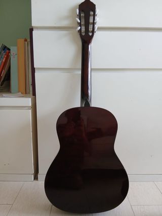 Guitarra clásica de tamaño reducido, ideal para iniciarse en la música. - Cuerpo de madera clara. - Mástil y clavijero en color burdeos. - Cuerdas de nylon.