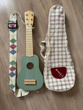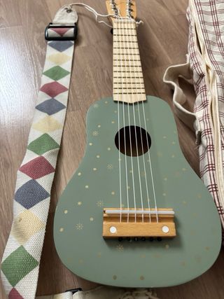 Guitarra infantil de Zara Home en color verde menta con detalles dorados. Incluye funda a cuadros y correa. - Guitarra de madera. - Funda con cierre de cremallera. - Correa ajustable con estampado de rombos.