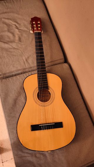 Guitarra española de tamaño infantil, ideal para iniciarse en la música. Su llamativo color amarillo la hace muy atractiva. - Cuerpo de color amarillo brillante. - Cuerdas de nylon. - Ideal para niños. Nunca usada.