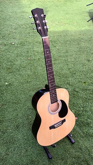 Guitarra acústica de iniciación marca Martin Smith con cuerdas metálicas. Se rompió antes de estrenarla, así que está sin usar. La pala está reparada, pero sólo afecta a la estética (última foto). Totalmente repasada y ajustada por guitarrista profesional. Dispone de alma ajustable. Sonido limpio y potente. Incluye funda de transporte, correa, soporte y cuerdas de recambio.