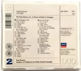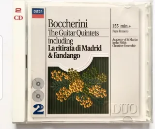 Este es un set de 2 CD de Boccherini, The Guitar Quintets, incluyendo La Ritirata di Madrid & Fandango. La duración total es de 155 minutos. - Intérpretes: Pepe Romero con la Academy of St Martin in the Fields Chamber Ensemble. - Sello discográfico: Decca. - Formato: Duo. NUEVO sin precintar