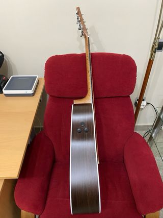 Guitarra acústica de tamaño completo, ideal para principiantes o aficionados. - Cuerpo de madera clara. - Diapasón oscuro con marcadores de posición. - Puente negro con seis clavijas. - Clavijero metálico con afinadores.