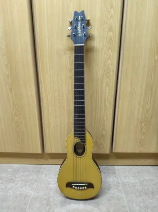 Guitarra de viaje Washburn Rober con 6 cuerdas. - Diseño compacto ideal para transportar. - Acabado en madera clara. - Funda de viaje acolchada.