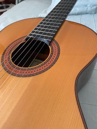 Guitarra hecha a mano con maderas macizas. Abeto para la tapa, palo santo de la India para el fondo y los aros y ébano para el diapasón. El mango está reforzado con una tira de ébano que queda oculta. El sonido es claro, rico y muy versátil. Los clavijeros son dorados. Esta guitarra es ideal para los músicos de nivel conservatorio, debido a la calidad de su sonido y materiales empleados. Incluye funda Cibeles.