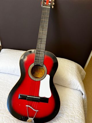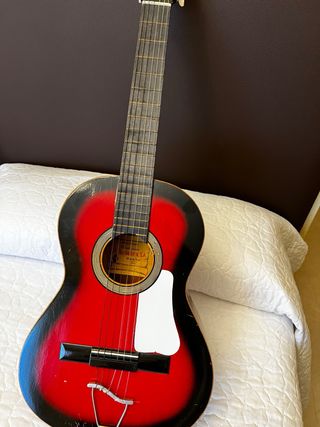 Guitarra española clásica, ideal para principiantes. Se incluye funda para su transporte y protección, además de un pedal. - Diapasón. - Pedal - Funda. Hace 20 años le tuve que cambiar los trastes porque se rompieron y la pegatina de vinilo es por una rotura en la caja. Suena bien para empezar, tiene las medidas estándar, pero quizá no no sea lo más indicado para un guitarrista profesional.