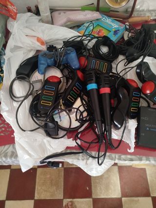 Lote de accesorios para PlayStation 2. - Mando de control azul. - Dos micrófonos. - Dos mandos de guitarra.