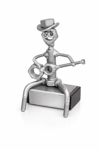 Figura decorativa de un guitarrista hecha con tuercas y tornillos. - Diseño artesanal. - Materiales metálicos. - Acabado plateado.