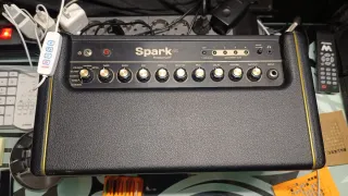 Amplificador de guitarra Positive Grid Spark de 40W. Ideal para practicar y tocar en casa. - Diseño compacto y portátil. - Acabado en negro con detalles dorados.