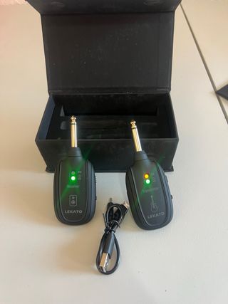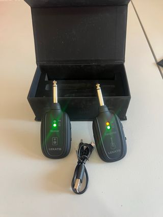 Sistema inalámbrico para guitarra LEKATO, ideal para conectar tu instrumento sin cables. Incluye transmisor y receptor. - Diseño compacto y portátil. - Indicadores LED de estado. - Incluye cable de carga USB.