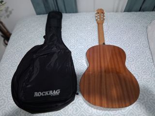 Guitarra clásica de madera con funda.Se compro en tienda especializada en guitarras. Usada 6 o 7 veces por la niña para clase. Costo más de 150 euros. Solo tiene las cuerdas rotas ni un solo arañazo, ni golpe, esta perfecta, se vende por no usar. - Funda marca Rockbag by Warwick. - Ideal para iniciarse en la música.