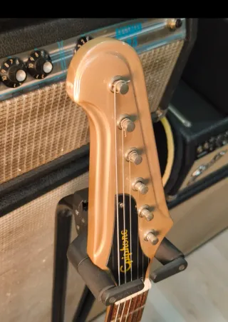 Guitarra eléctrica Epiphone Joe Bonamassa, edición limitada. - Acabado dorado. - Pastilla humbucker. - Golpeador blanco con logo. - Controles de volumen y tono. Abstenerse cambios