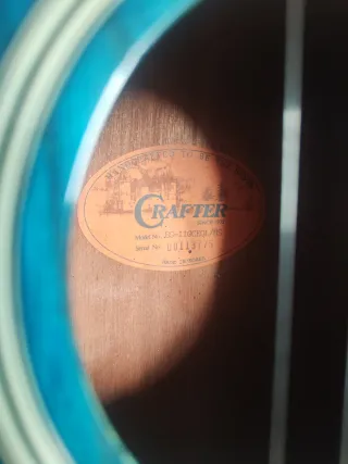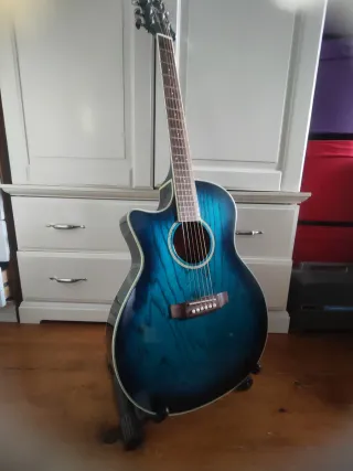 Guitarra electroacústica Crafter para zurd@s con un acabado degradado en tonos azules. - Cuerpo con cutaway - Modelo: EG-110CEQ/MS - Número de serie: 00113775 - Fabricada en Corea. Con funda semiriguida. En muy buen estado.