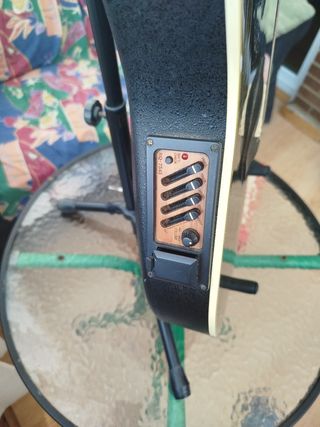 Guitarra electroacústica Academy. Funciona perfectamente. Tiene un clavijero cambiado en negro que encuerda al revés, de ahí su precio. Habrìa que cambiar las cuerdas del tiempo que lleva parada. No hago envíos y regalo funda básica.