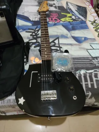 Guitarra eléctrica negra con un diseño moderno y llamativo. Ideal para principiantes o músicos intermedios. - Cuerpo de guitarra eléctrica. - Color negro brillante. - Incluye accesorios como púas y cuerdas de repuesto.