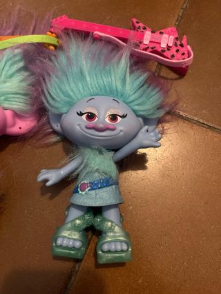 Lote de dos muñecas Trolls con sus accesorios. - Una muñeca es de color rosa con pelo turquesa y falda de pelo. - La otra muñeca es de color azul con pelo turquesa y vestido azul. - Incluye dos guitarras, una rosa y otra naranja/amarilla.