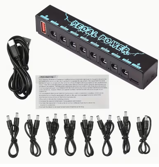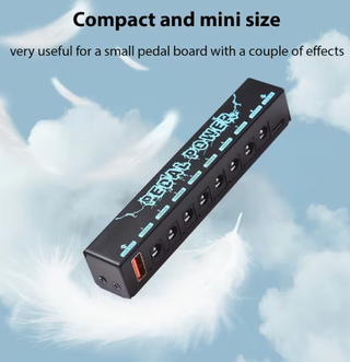 Fuente de alimentación compacta y de tamaño mini, ideal para pedaleras pequeñas. - 8 salidas para pedales de guitarra. - Diseño compacto y ligero. - Muy útil para configuraciones de efectos limitadas.