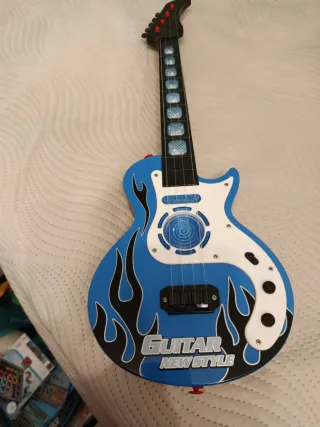 Guitarra de juguete con un diseño llamativo en color azul y negro con detalles de llamas. - Incorpora luces LED en el mástil. - Botones de control en el cuerpo. - Altavoz integrado.