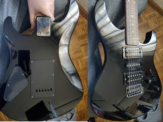 Guitarra eléctrica SGR C-1 en acabado granate oscuro con soporte y funda incluidos. Está en buen estado, con algunas señales normales de uso. Tiene un pequeño desperfecto en el lateral como se puede ver en la imagen. No hago envío para la guitarra.