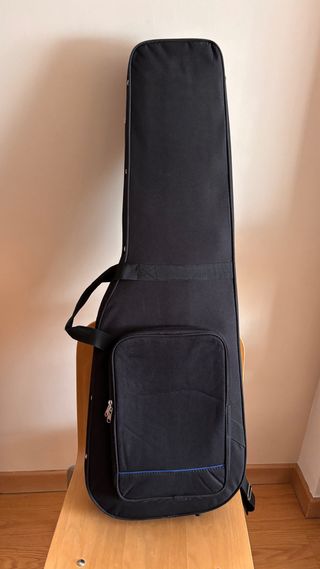 Funda rígida negra para guitarra eléctrica estilo Les Paul. Protege tu instrumento con estilo. - Exterior de tela resistente. - Interior acolchado. - Bolsillo frontal con cremallera. - Asas de transporte y correa. - Ribete azul decorativo.