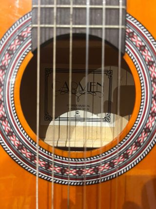 Auténtica guitarra española de la marca Admira. Un instrumento clásico con un diseño tradicional. - Cuerpo de madera con acabado degradado. - Diapasón con trastes. - Clavijero metálico. Del uso solo tiene dos marcas, pero que tampoco se notan mucho  es una buena guitarra para pasarlo bien estas fiestas o para un regalo A los interesados puedo pasarle un vídeo para que vean bien la guitarra