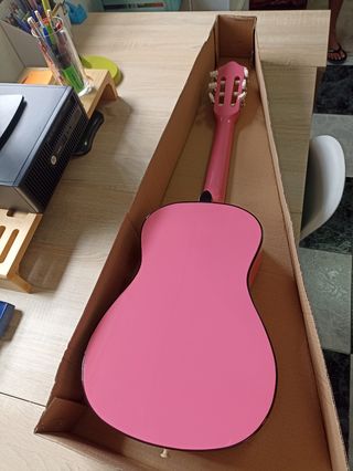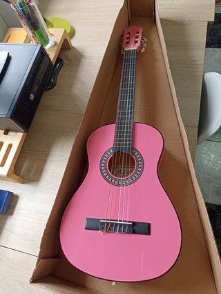 Guitarra de madera, ideal para iniciarse en la música. - Cuerpo de madera clara. - Diapasón con trastes. - Cuerdas de nylon. Tiene algunos arañazos y tiene una parte despegada. El precio es negociable.