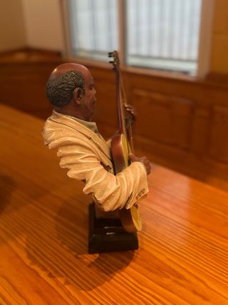 Estatua detallada de un músico tocando la guitarra. - Figura de resina con acabado realista. - Representación de un hombre mayor con traje y sombrero. - Instrumento musical incluido. - fabricada en poliresina y pintada a mano individualmente