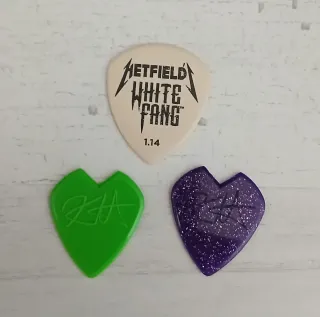 Pack de púas de guitarra de Metallica, obtenidas el 3 de Julio de 2022,en el Estadio Nuevo San Mamés de Bilbao. - Púa White Fang 1.14 de James Hetfield. - Púa verde con firma de Kirk Hammett. - Púa morada con purpurina y firma de Kirk Hammett. - Vendo las 3 juntas,no por separado. SÓLO HAGO ENVÍOS POR WALLAPOP CORREOS,NO POR INPOST POR MALAS EXPERIENCIAS.