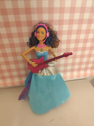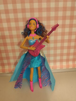 Muñeca Barbie con temática de rock, lista para dar un concierto. - Incluye guitarra rosa. - Auriculares rosas. - Vestido azul brillante con detalles. - Botas rosas.