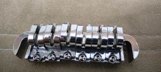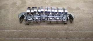 Puente para guitarra eléctrica de la marca Babicz. Pieza de metal cromado con diseño individual para cada cuerda. - Construcción robusta de metal. - Acabado brillante. - Diseño de 6 selletas. Se trata del puente; Babicz FCH Tune O Matic Bridge C La medida entre centros es de 74 milímetros El casquillo grande mide 12 milímetros de diámetro exterior El casquillo pequeño 7 milímetros de diámetro y entra dentro del grande a presión si fuera necesario. No tengo el cordal, sólo entrego lo que se ve en las fotos junto con la llave Allen de ajuste