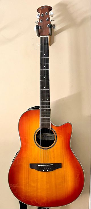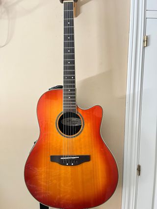 Guitarra electroacústica Applause by Ovation, modelo AE128, con un acabado degradado en tonos naranjas y rojos. - Cuerpo con cutaway. - Mástil de madera. - Diapasón con marcadores de posición. Selector de volumen, Gain y ecualizador