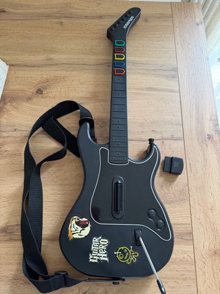 Guitarra Kramer para Guitar Hero 3 Legends of Rock + juego PS2. Incluye correa y receptor inalámbrico. - Diseño inspirado en guitarra eléctrica. - Botones de traste de colores. - Barra de rasgueo. - Botones de acción en el cuerpo. 📦 Entrega en mano o envío por Wallapop.