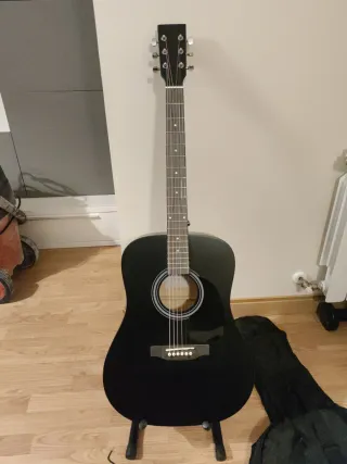Guitarra acústica negra en excelente estado, prácticamente a estrenar. Incluye todos los accesorios necesarios para empezar a tocar. - Guitarra acústica negra - Soporte para guitarra - Funda de transporte - Correa para guitarra