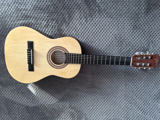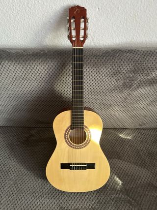 Guitarra clásica de tamaño reducido, ideal para iniciarse en la música. Se encuentra en perfecto estado. - Cuerpo de madera clara. - Diapasón negro con trastes. - Clavijero dorado.