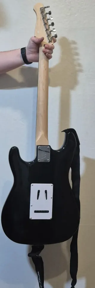 Guitarra eléctrica en color negro con acabado brillante. Ideal para iniciarse en el mundo de la música. - Cuerpo de madera. - Mástil de arce. - Diapasón de palisandro. - Tres pastillas single-coil. - Puente cromado. - Tres potenciómetros (volumen y tono). - Selector de pastillas de 5 posiciones.