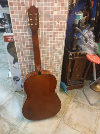 Guitarra clásica marca José Torres en buen estado (algunas cuerdas están oxidadas), ideal para principiantes. Incluye dos métodos: "Cien estudios progresivos para guitarra" de José Lazaro Villena y "Método para guitarra, Libro 1" de Guitarras Manuel Rodríguez and Sons. También van un afinador eléctrico y la funda.