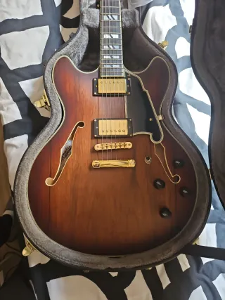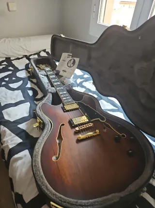 Guitarra D'Angelico Deluxe DC con acabado Satin Brown Burst. Un instrumento elegante y versátil. - Semihueca con doble cutaway y bloque central - Mástil de arce/nogal/arce - Mástil en forma en 'C' estrecha - Diapasón de ébano - Inlays en madreperla - 22 trastes intactos - Pastillas Seymour Duncan Seth Lover A4 - 2 controles de volumen - 2 controles de tono (push pull para split) - Switch de 3 posiciones - Clavijas de afinación Grover 509 Super Rotomatic Tuner - Incluye estuche - Straplocks dorados Comprada en Thomann hace pocos meses y usada exclusivamente en casa 5 veces contadas. No tiene ni una marca de uso. (Precio nueva 1700€)