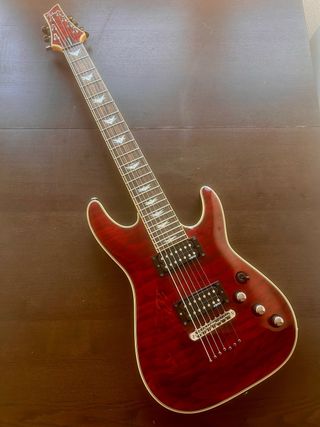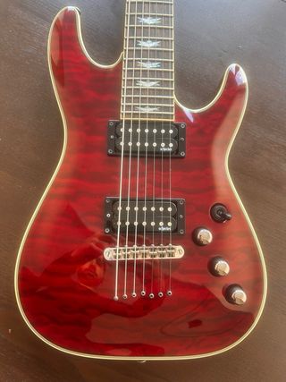 Guitarra eléctrica Schecter Omen Extreme 7. Con señales de uso pero en perfecto estado. Se le ha cambiado una clavija - Cuerpo con tapa de arce flameado. - Mástil de arce. - Diapasón de palisandro. - Pastillas humbucker dobles. - Potenciometro push-pull para coil split