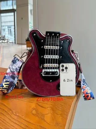 Bolso con diseño de guitarra, llamativo y original. - Acabado en cuero sintético. - Detalles metálicos. - Correa ajustable. - NUEVO A ESTRENAR