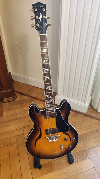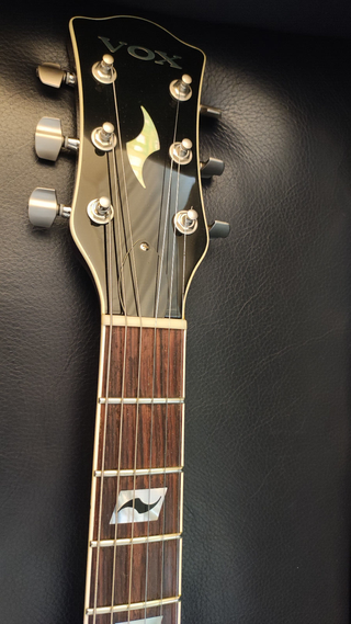Guitarra eléctrica Vox Virage Double Cut de 2008, fabricada en Japón. No confundir con la posterior Virage II de construcción inferior Tapa y fondo de caoba tallada en madera maciza Longitud del cuerpo 17,5 pulgadas (446 mm). Ancho 14,5 pulgadas (368 mm) Cuerpo curvo y contorneado para un uso ergonómico Sistema de pastillas VOX Three-90 por DiMarzio USA. Cada pastilla es conmutable entre bobina simple, P90 y Humbucker para ofrecer tonos Limpios, Crunch y Lead Acceso fácil a los trastes superiores gracias al diseño del entronque entre mástil y cuerpo Puente de aluminio fundido Estuche rígido original #Gibson #PRS #Guild