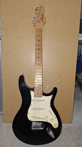 Guitarra eléctrica de color negro con detalles en blanco y crema. Ideal para principiantes, aficionados o restauración. - Cuerpo de guitarra eléctrica. - Mástil de madera clara. - Seis cuerdas metálicas. - Tres pastillas. - Tres potenciómetros de control. Se desconoce si funciona o su estado más allá de lo que se ve en las fotos, tornillos oxidados, un par de golpes.
