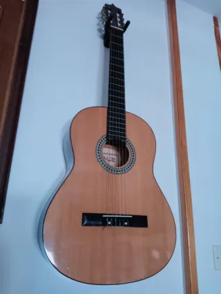 Guitarra española clásica con funda. - tiene golpe parte inferior ver foto, funciona perfectamente. - Cuerpo de madera. - Cuerdas de nylon. - Funda a cuadros incluida.