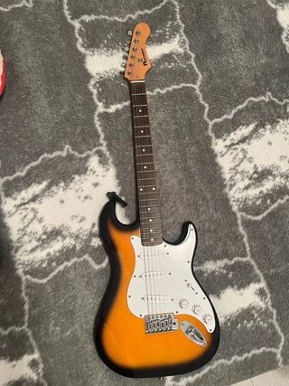Guitarra eléctrica de la marca Rochester Guitars con un acabado degradado de naranja a negro. - Cuerpo de madera. - Mástil de madera. - Diapasón con puntos incrustados. - Tres pastillas. - Puente metálico. - Le falta una cuerda!