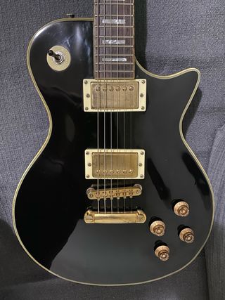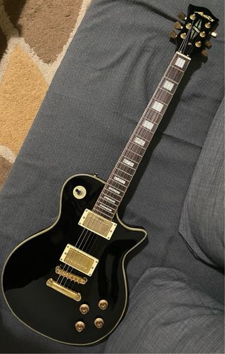 Guitarra eléctrica Atrics estilo Les Paul con acabado negro brillante. Ideal para principiantes. Evidentes marcas de uso - Cuerpo sólido. - Pastillas dobles doradas. - Herrajes dorados. - Clavijero estilo Grover